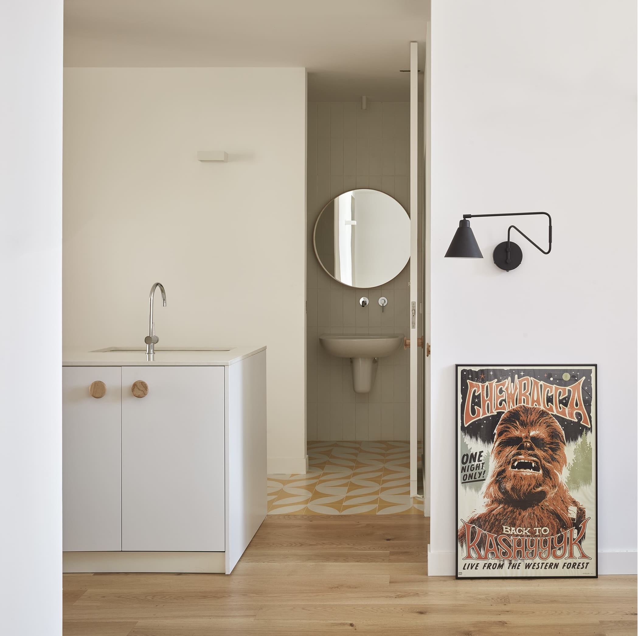 Hoy, esta vivienda respira contemporaneidad sin perder su memoria. Es un espacio que fluye, donde lo nuevo y lo viejo conviven con naturalidad. Los materiales cálidos, la luz filtrada y los acentos de color componen un hogar que invita a vivirlo: un lugar desenfadado, luminoso y lleno de energía, tan único como el barrio que lo acoge.
